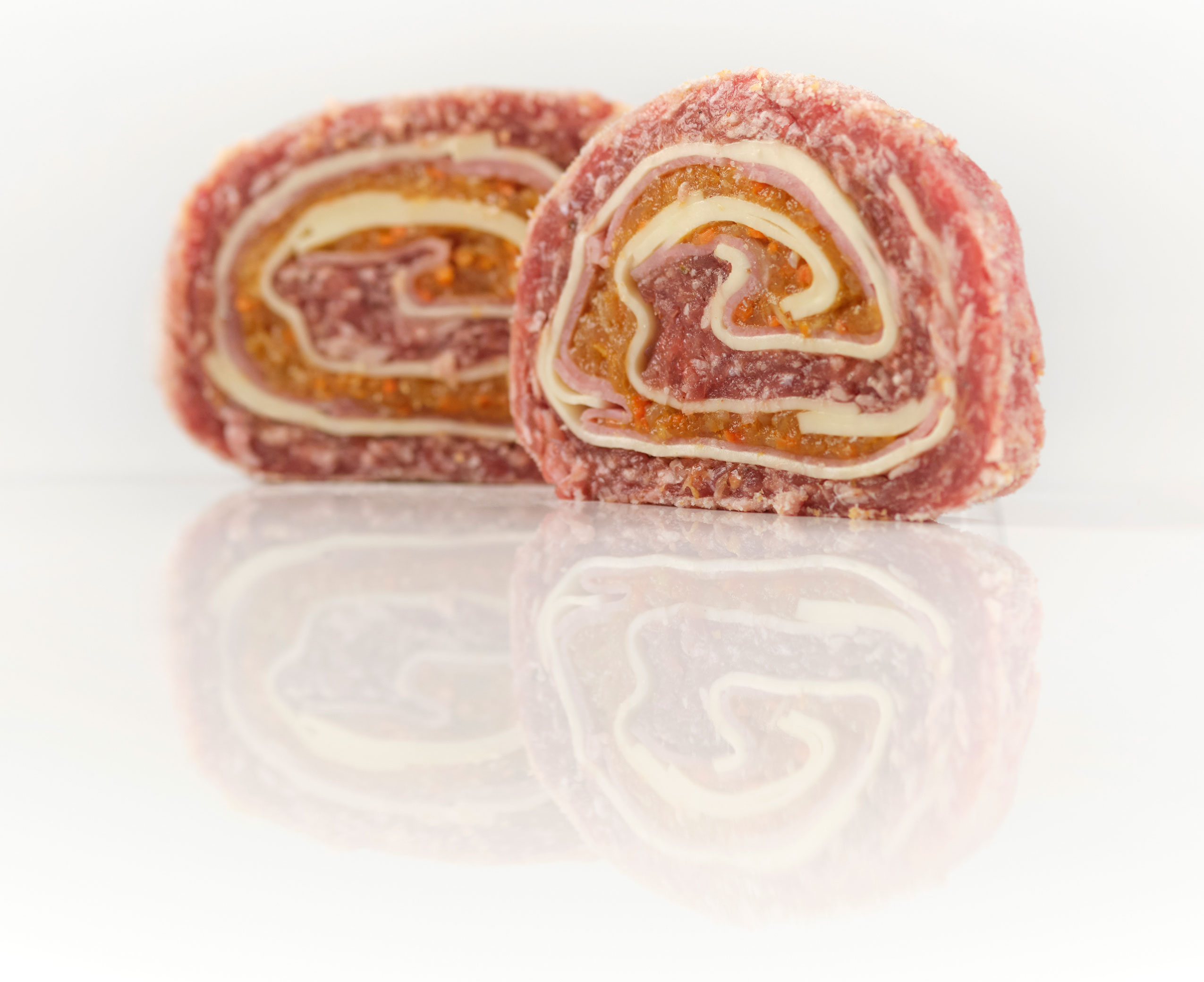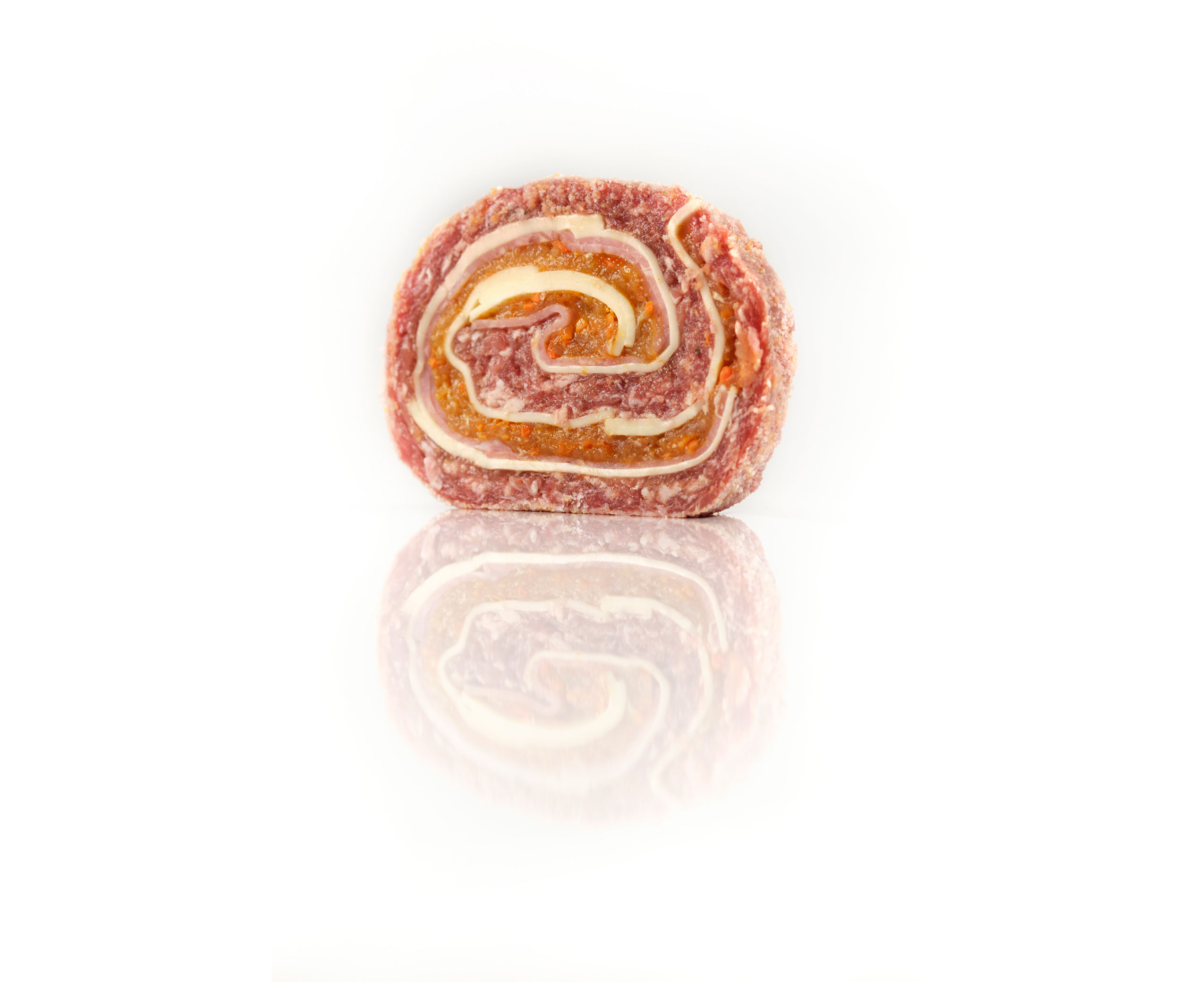Rollito de carne picada mixta, jamón york y queso, con pollo y zanahoria.